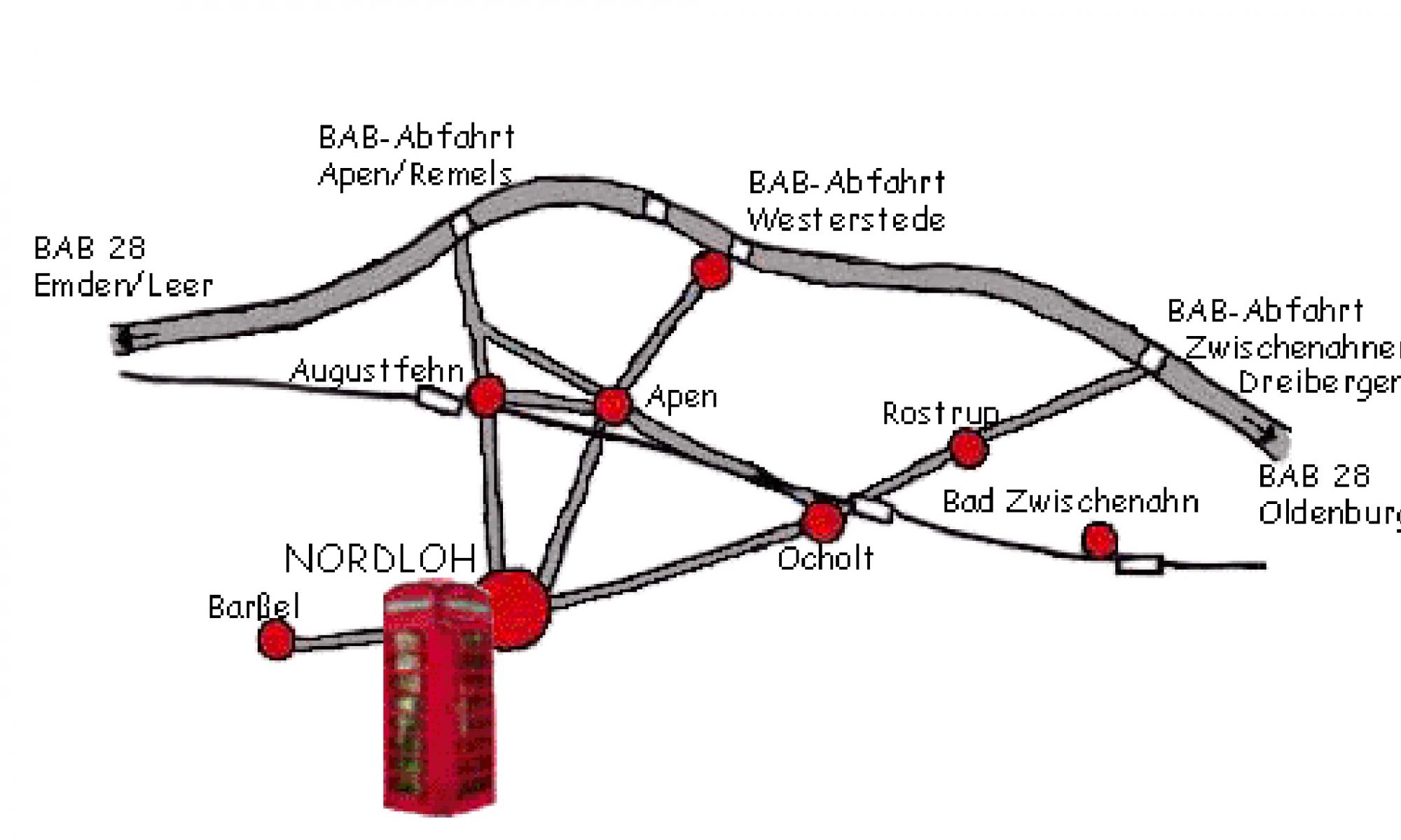 A28 Oldenburg – Leer: Abfahrt Apen-Remels Richtung Augustfehn. Durch Augustfehn Richtung Barßel fahren. An der T-Kreuzung in Nordloh müssen Sie links abbiegen und fahren schon auf das Seminarhaus zu.
